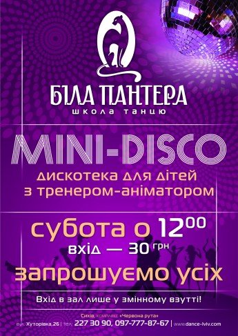 Дискотека для дітей з тренером аніматором. Вхід в зал лише у змінному взутті.