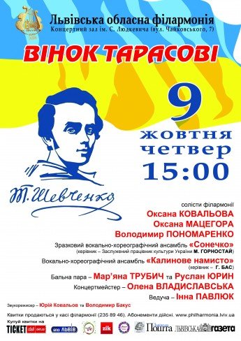 Концерт присвячений 200-річчю від дня народження Тараса Шевченка – це своєрідний віночок пісень, танців, віршів на Т. Г. Шевченка і в пошану великого Кобзаря. Прославляти його творчість будуть солісти Львівської філармонії Оксана Ковальова, Оксана Мацегора, а також Володимир Пономаренко.