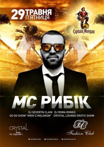 За підтримки Captain Morgan, зустрічає наш літній сезон – напевно, найкращий клубний МС країни – Рибік (Ibiza Club Resident, Шеф-редактор MAXIM) .Його голос прикрашає не один десяток танцювальних хітів, а вечірки за його участю – ще до їх початку називають успішними. Як би там не було, пересвідчитись в цьому факті ви зможете особисто – вже 29 травня МС Рибік завітає у «Fashion Club».