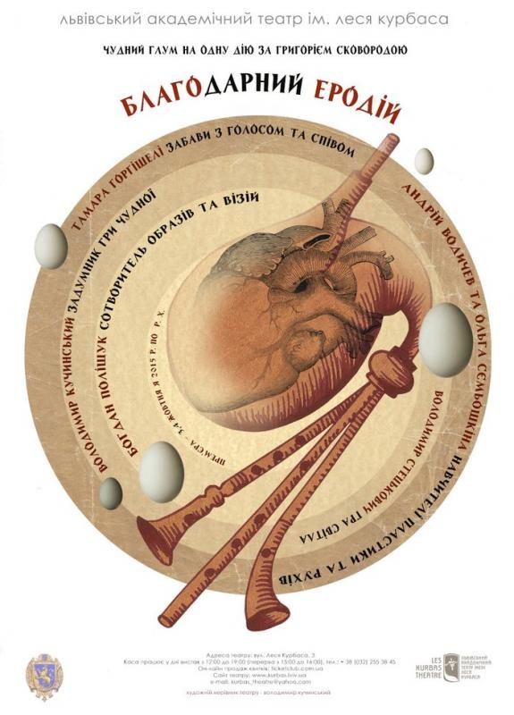 В одному із найвідоміших діалогів Григорія Сковороди мавпа Пишек і лелека Еродій розмислюють про вдячність як запоруку життєвої радості і внутрішнього спокою людини. У виставі філософські тексти переплітаються з образами картин Босха, що присутні у костюмах і проекціях. Це одна із візуально найкрасивіших вистав театру, що має давню історію, адже перша редакція «Благодарного Еродія» з’явилася в театрі ще у 1993 році і стала одією із знакових у новітній історії українського театру.