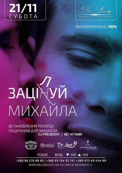 Відсвяткуй іменини свого друга, родича, чи просто товариша! Спеціально для Михайликів відбудеться встановлення рекорду поцілунків! Також для іменинників знижка на вхід -50%!