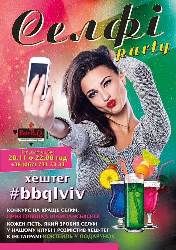 Селфі-party - це весела, розкута, модна і дуже весела тусовка. Тут кожен може реалізувати свій фото-креатив і стати кращим фотографом вечора та отримати подарунок! Всі хто зробить у нас селфі, опублікує у себе на сторінці у соцмережах із поміткою хештег - отримає коктейль у подарунок!