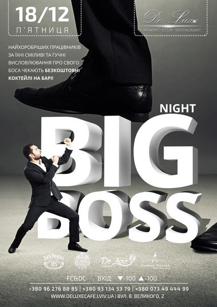 Маєш запитання до свого боса і не знаєш як їх вирішити? Тоді запрошуй його в п'ятницю 18 грудня до нас та вирішуй все на позитиві! Найхоробріших "підлеглих" за їхні сміливі та гучні висловлювання про свого боса чекають Безкоштовні коктейлі на барі!