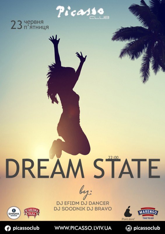 Мабуть у кожного з вас, інколи, з’являється такий стан душі коли хочеться забути про всі негаразди та проблеми, які вас оточують. Виникає бажання поїхати кудись дуже далеко, де немає міської метушні…Dream state занурить вас у справжню атмосферу відпочинку та ейфорії. Ми подбаємо про те, щоб ця ніч була для вас незабутнью.