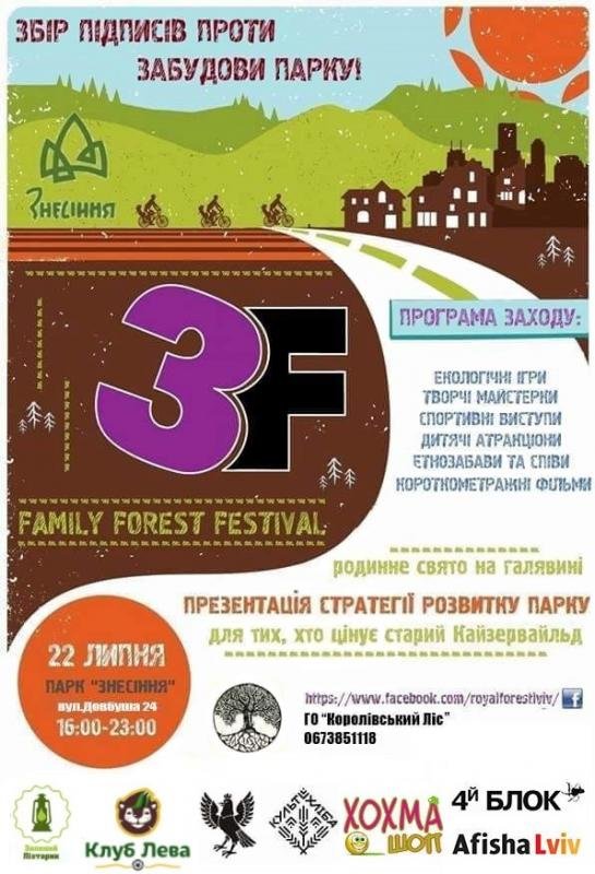У Львові пройде фестиваль лісопаркового дозвілля — 3F (Family Forest Festival ). Подія проходитиме у форматі урбан-пікнік. Львів'ян та гостей міста запрошують провести вихідний день на лоні природи і закликають підтримати ініціативу збору підписів проти забудови парку.