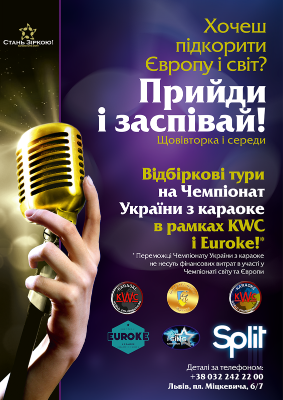 Спліт запалює Зірки! Чемпіонат України з караоке, Чемпіонат світу у Ванкувері, Чемпіонат Європи у Будапешті! Ярослав Работицький, Оксана Караїм – вони підкорили світ! Львів’яни підтверджують співучість української нації! Бажаєш бути наступним? Бери участь у відбіркових турах до Чемпіонату України з караоке Спліт – з нами Стають Зірками!
