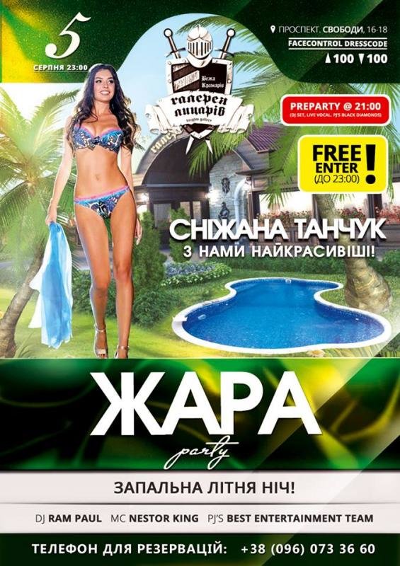 Приходьте разом з друзями та відривайтесь на повну. Найкрасивіші дівчата нашого міста відпочивають саме з нами. Ці шалені серпневі ночі не забудуться ніколи, адже Ваш яскравий відпочинок зафіксує на камеру наш клубний фотограф. Врятуватись від спеки за вікном допоможуть пянкі та прохолодні коктейлі від наших барменів. Ви зможете насолодитись та відпочити під кращі музичні новинки та танцювальні хіти та мікси цього сезону, які подарують вам наші резиденти dj IgorOk & dj RamPaul.