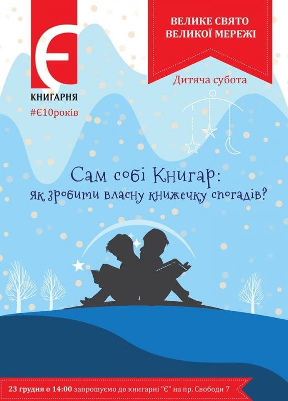 З нагоди 10-річчя мережі Книгарень «Є» запрошуємо наших маленьких читачів пізнати процес книговидавництва власними руками – разом із досвідченим майстром кожен створюватиме невелику книжечку, малюватиме ілюстрації, писатиме спогади та цікаві тексти, а головне – дітлахи отримають приємні сувеніри з нагоди дня народження Книгарні «Є»!