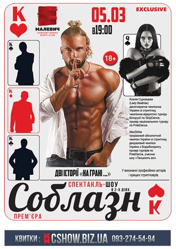 У поданні беруть участь: 10-кратна чемпіонка України зі стриптизу, чемпіонка відкритого турніру Білорусії по Strip Dance карколомна Ксенія Суровцева (Lady Beatrise) і 3-кратний абсолютний чемпіон України зі стриптизу, 2-разовий чемпіон України з бодібілдингу, призер Pole Dance, учасник телешоу «Танцюють всі» Алекс Страйк. Після шоу - Фотосесія з головним «мачо» країни.