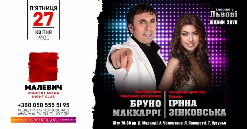 Вперше у Львові неймовірний дует-золотий голос Риму Бруно Маккаррі та заслужена артистка України Iрина Зінковська. Вибухова суміш італійської пристрасті та української ніжності стирають будь-які кордони між виконавцями і слухачами та понурюють у чарівний світ хітів 70-80рр.Тото Кутуньо, Джанні Моранді, Адріано Челентано, Лучано Паваротті. Чуттєвий спів та яскравий балет легко розкривають зміст та глибину всіх пісень, виконаних італійською та українською мовами. Поспiшайте!!! Спецiальний подарунок вiд виконавцiв-розiграш подорожi на двох в чарiвну Iталiю (перелiт та проживання на 3днi включено)!!!! VIP 1 і VIP 2 - це окремі ізольовані кімнати підвищеного комфорту, на другому поверсі, із скляною стіною, вмістимість 14 та 10 людей відповідно; Sky Lounge 1,2,3 - це окремі VIP-балкони на третьому поверсі з окремим обслуговуванням та невеликою кількістю відвідувачів.