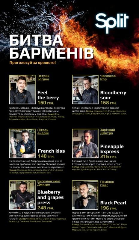 Битва барменів! Що це? Давате допоможемо обрати кращого. Підтримаймо улюбленого бармена, придбавши його коктейль із даної пропозиції.