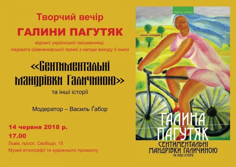 Творчий вечір письменниці відбудеться 14 червня о 17.00 в Актовій залі Музею етнографії та художнього промислу , пр.Свободи ,15 (2поверх) з нагоди виходу книги «Сентиментальні мандрівки Галичиною та інші історії».