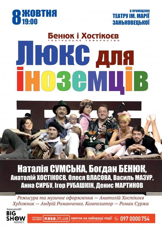 8 жовтняо 19.00 на сцені театру ім. Марії Заньковецькоїулюблені народні артисти України презентують захоплюючу комедію про курйози сімейного життя«ЛЮКС ДЛЯ ІНОЗЕМЦІВ»!