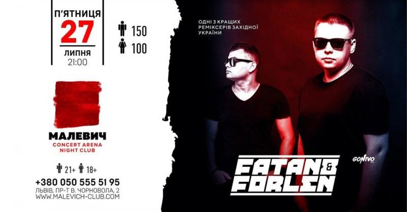 Fatan & Forlen – популярні львівські ді-джеї, ремікс-мейкери і продюсери, резиденти вже відомого тобі українського музичного лейблу Gonivo Records. Ці хлопці завжди в курсі останніх музичних новинок та трендів, і вміють дивувати нестандартними міксами, якими топові dance-станції країни заповнюють ефір! Хочеш почути їх трек-фурор на слова Домагоя Віди – приходь ввечері в Малевич!