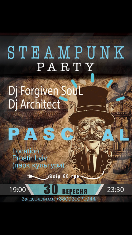 Зустрічайте першу у Львові вечірку у стилі SteamPunk . ЩО БУДЕ? музика ломаних ритмів і глибокого басу з неповторними Forgiven Soul та Architect позитивний заряд емоцій на осінь незабутній час проведений з друзями в іншій реальності А ще зможете покуштувати справжнього м‘яса на грилі під ВІДКРИТИМ НЕБОМ. НЕ ПРОПУСТІТЬ можливість зануритись в справжню атмосферу STEAMPUNK КУЛЬТУРИ. Атрибутика цього вечора: аксесуари зі шкіри, бронзи чи сталлю. Будьте креативними:) Локація: Prostir Lviv (Парк Культури) Вхід: 60 грн У steampunk костюмі - вхід БЕЗКОШТОВНИЙ!!!
