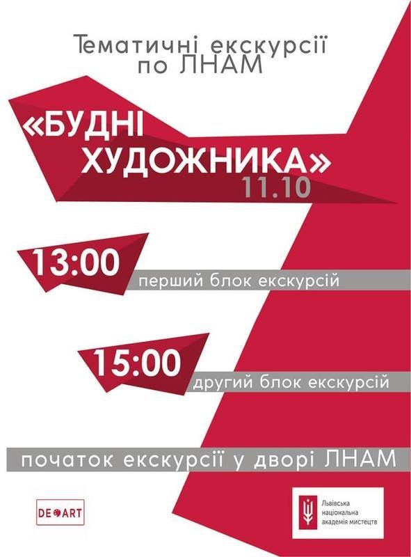 11 жовтня о 13.00 та 15.00 у Львівській національній академії мистецтв відбудуться тематичні екскурсії «Будні художника» у рамках проекту «ДеАрт». Захід приурочений до святкування Міжнародного дня художника.