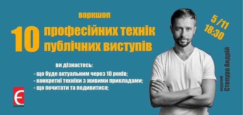 Книгарня “Є” та видавництво “Моноліт” запрошують на майстер-клас Андрія Степури "10 потужних технік в публічних виступах". Захід відбудеться 5 листопада, початок — о 18.30.Світ не стоїть на місці. Змінюється усе - технології, світогляд, мораль. І це не оминуло й публічні виступи. Сучасні презентації не мають права бути такими, якими вони були ще 10 років тому. Презентація, що колись викликала овації, зараз може породити мертву тишу. Стандарти змінюються і постійно ростуть.На майстер-класі Андрія Степури ви дізнаєтеся про те, куди котиться світ публічних виступів, що треба знати про психологію сприйняття, щоб залишитися в тренді завтра, через рік і через 10 років. Андрій Степура покаже конкретні техніки, що базуються на реальних дослідах та спостереженнях. А щоб було ще крутіше і практичніше - продемонструє їх на прикладі потужних ораторів.Андрій Степура - підприємець, засновник школи ораторського мистецтва «Майстерня Лева». Досліджує та експериментує в галузі публічних виступів з 1999-го року. Сертифікований НЛП-практик (Анна Принц, м. Київ);сертифікований бізнес-тренер та коуч (Іцхак Пінтосевич, м. Київ); учасник річного базового курс з Позитивної психотерапії;провів 100+ місячних курсів з публічних виступів; автор книжки “WOW-виступ по-українськи” Видавництво «Моноліт-Bizz».