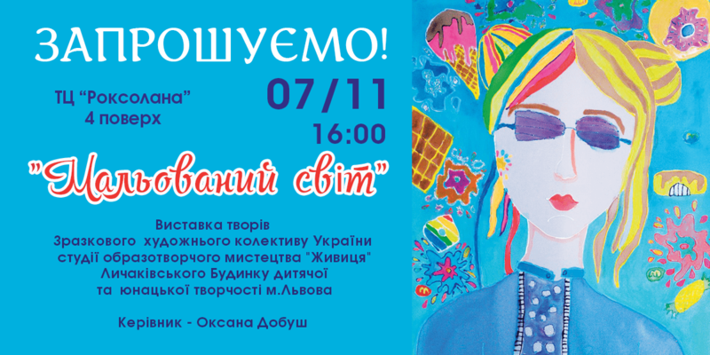 Запрошуємо на відкриття виставки творчих робіт студії образотворчого мистецтва «Живиця» Личаківського БДЮТ м. Львова – «Мальваний світ», що відбудеться 7 листопада 2018 року, о 16:00 у арт-просторі ТЦ «Роксолана».