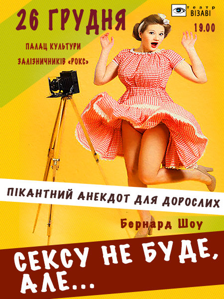 26 грудня в приміщенні Палацу культури залізничників “РОКС”о 19.00 Київський театр ВІЗАВІ представляє ретро-комедію для дорослих СЕКСУ НЕ БУДЕ, АЛЕ .... Лондон. Початок століття. Місто незмінних традицій. А деякі старі звичаї не втратили значення і до нашого часу. Так, наприклад, будь-яка подружня пара, яка прожила разом чотири роки і, не має дітей, має право за певну оплату запросити Державного мужа для надання практичної допомоги у цій делікатній справі. Місіс Дороті Кембл, до речі, вельми побожна особа, з острахом і смиренням чекала Державного мужа. Її чоловік, містер Кембл, втративши остаточну надію побачити спадкоємця, рішуче запропонував дружині викликати додому Державного мужа. В цей же час відомий англійський фотограф Девід Лінч отримав чергове замовлення на створення численних фотографій на дому. На нього чекає Барбара. Вона володіє єдиною пристрастю: любить фотографуватися. І, як ви розумієте, наші герої переплутали квартири. Державний муж прийшов до любительки фотографуватися, а Фотограф - до жінки, яка чекає на Державного мужа. Захоплююча ексцентрична ретро-комедія. Джаз, чарльстон, відеопроекція, танці та костюми початку епохи ... Квитки можете придбати в касах: Karabas.com kasa.in.ua Concert.ua