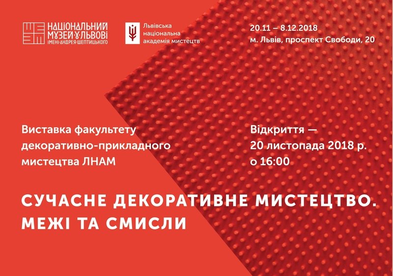 20 листопада 2018 р. о 16:00 у НМЛ відбудеться відкриття виставки творів із художньої кераміки, скла, текстилю, дерева та металу, що має на меті продемонструвати новий зріз сучасного декоративного мистецтва крізь призму творчості професорсько-викладацького складу та аспірантів факультету Декоративно-прикладного мистецтва ЛНАМ.