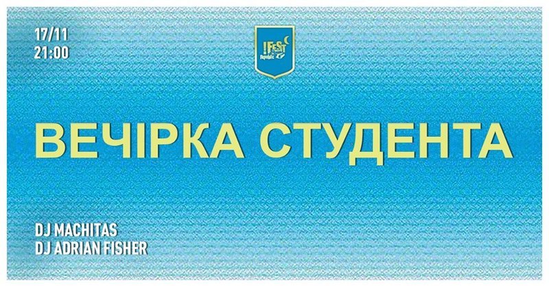 Всі ми були, є, або будемо студентами. А це означає, що День Студента - це свято для кожного.Давайте проведемо цей вечір безтурботно та весело в крутій атмосфері на !FESTrepublic.Це буде гаряча ніч!Музичний сапорт: Adrian Fisher (Adrian Fisher), Machitas (Taras Muchychka)Ведучий: Ozz (Andriy Ozarkiv)Початок о 21:00 Попередній продаж квитків - 70 грнhttps://gastroli.ua/tickets/17-listopada-vechirka-studenta/buyВ день події - 100 грн.FC/DC 18+
