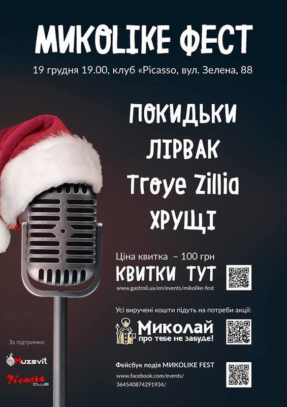 На благодійному концерті «МИКОlike ФЕСТ» завершення однієї з найчарівніших акцій разом з волонтерами та гостями святкуватимуть гурти Лірвак, Хрущі, Troye Zillia та Покидьки. На кошти виручені від попередньо проданих квитків будуть закуплені солодощі, іграшки, засоби гігієни на канцелярське приладдя для подарунків до дня Святого Миколая для 2800 дітей з багатодітних та малозабезпечених родин міста Львова.