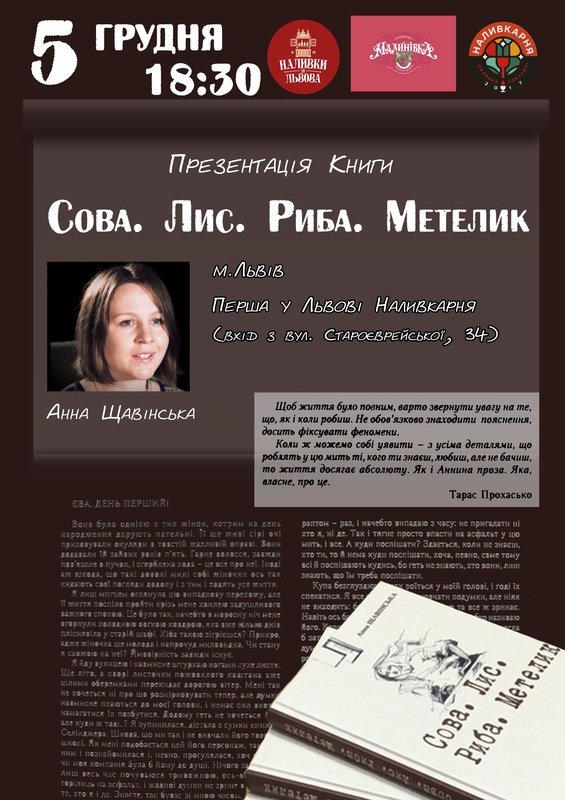 Запрошуємо Вас на презентацію книги «Сова.Лис.Риба.Метелик» рівненської журналістки Анни Щавінської. Захід відбудеться 05 грудня, о 18.30, у м. Львів, у приміщенні першої у Львові Наливкарні (вхід з вул. Староєврейської, 34).