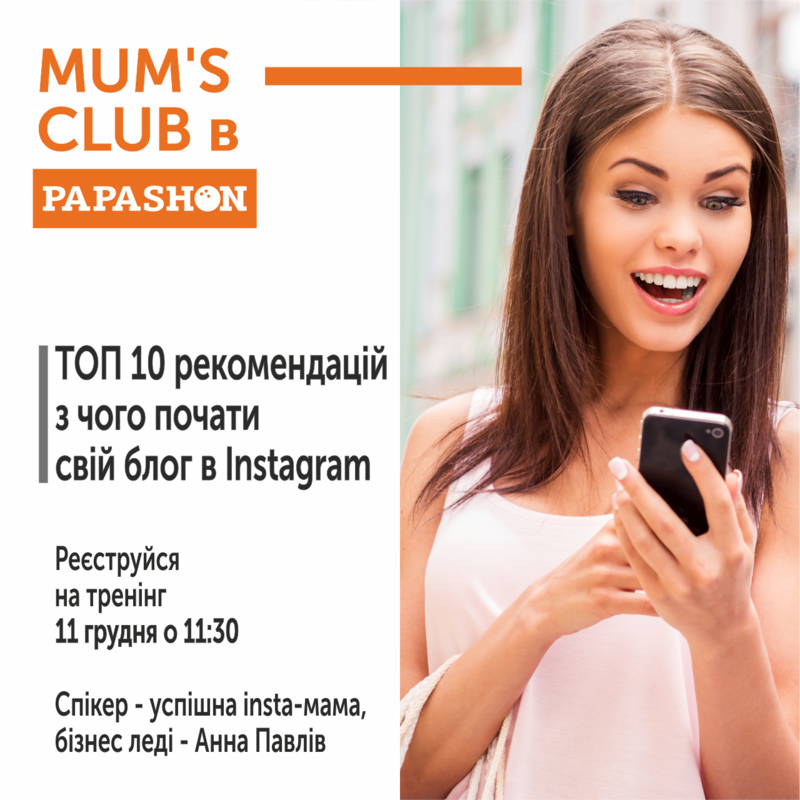 Реєструйтесь на майстер-клас "ТОП 10 рекомендацій з чого почати свій блог в Instagram" від MUM'S club в Papashon  11.12.(вт.) о 11:30