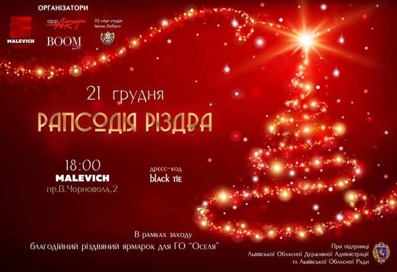 «Malevich» організація ARTapp, журнал BOOM plus TV, АРТ студія Івони Лобан, клуб Малевич, організовують благодійний захід «Рапсодія Різдва» при підтримці Львівської Обласної Державної Адміністрації та Львівської Обласної Ради.