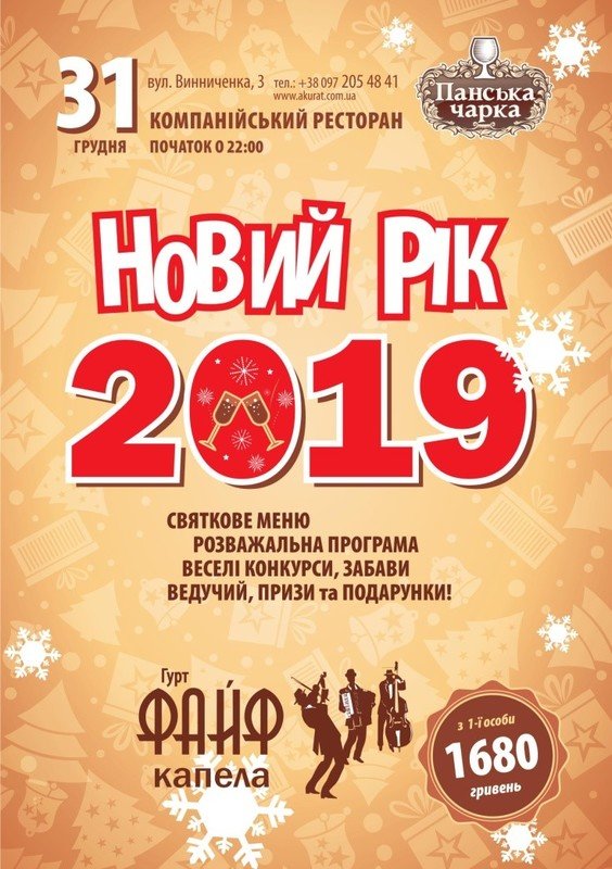 Зустрічаємось 31.12.2018 р.Початок о 22:00Бронювання за телефоном: +38 (097) 205 48 41
