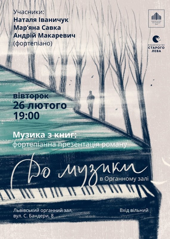 Музика з книг: фортепіанна презентація роману «До музики» в Львівському органному залі Музика з книг – неочікуваний формат представлення прози, який допоможе розкрити глядачам особливу атмосферу роману «До музики». Чуттєві розмови про книгу з перекладачкою Наталею Іваничук та модератором Мар’яною Савкою в поєднанні з музичними етюдами Кетіля Бйорнстада та живим фортепіанним виконанням творів, які неодноразово зринають на сторінках роману - цей літературно-музичний вечір однозначно зачарує вас. Тож запрошуємо усіх любителів якісної прози та класичної музики 26 лютого о 19.00 до Львівського органного залу (вул. Степана Бандери, 8). Вхід вільний. Роман «До музики» занурює читача у складний і емоційний світ молодих піаністів, які товаришують, конкурують, знемагають під постійним тиском батьків, учителів, критиків і власних амбіцій. Понад усе вони люблять музику, яка стала для них життям, мірилом успіху, спортом, єдиним сенсом. Головний герой, юний Аксель Віндінґ, живе музикою, своєю грою відсторонюється від почуттів та жалів, які його спіткали, втрати мами і втрати сім’ї, яка розпалася після маминої загибелі. Аксель відчуває, як витоншується і вислизає крізь пальці його кохання, як зникають одна за одною дорогі йому речі. Єдине, що залишається хлопцеві, — це музика, яку він хоче підкорити. «До музики» — роман про дорослішання, смерть, кохання і насилля, безпорадність і пристрасть. Під час музичної частини заходу відомий львівський піаніст-віртуоз Андрій Макаревич представить публіці твори Бетховена, Шопена, Брамса, Ґріґа та Дебюссі – яскраву музику, що з перших нот занурює у прекрасний світ рафінованого мистецтва. Зокрема прозвучать: «Революційний етюд» Шопена, Дебюссі «Місячне сяйво» з «Берґамаської сюїти» та «Дівчина з лляним волоссям», «Вальдштайн-соната» Бетховена, «Весільний день у Трольгауґені» Ґріґа, Опус 119 Брамса – твори, які справили величезний вплив на життя головних героїв роману «До музики».