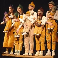 Разом з ними на сцені – їх зменшені копії, п’ятеро ляльок у таких же комбінезонах та кольорових шапках. В руках музикантів – віолончель, контрабас, акордеон, мелодика, саксофон, ксилофон та перкусії.