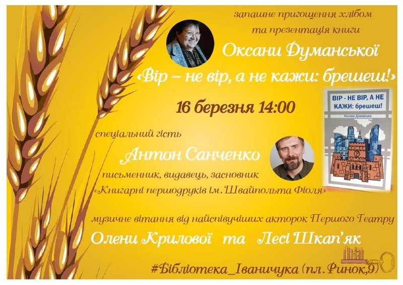 У суботу 16 березня о 14:00 у Львівській обласній бібліотеці для юнацтва ім. Романа Іваничука (пл. Ринок, 9) відбудеться презентація книги «Вір ‒ не вір, а не кажи: брешеш!» Оксани Думанської.