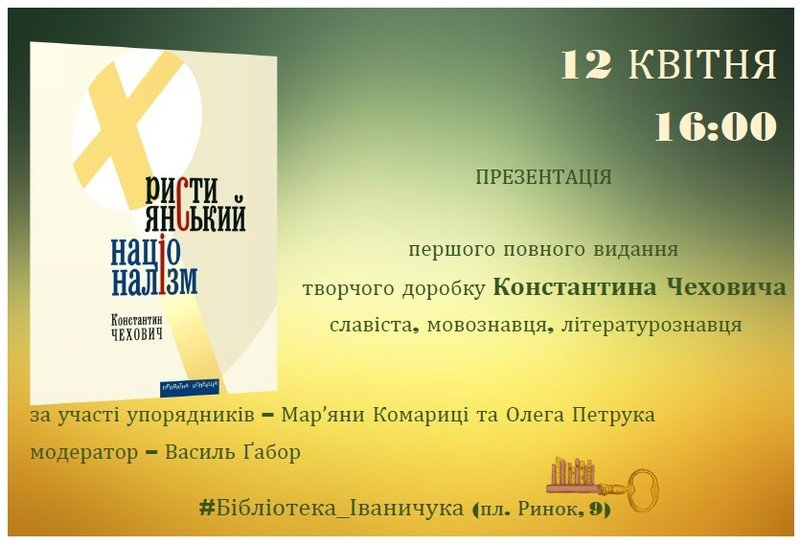 У п’ятницю 12 квітня о 16:00 у Львівській обласній бібліотеці для юнацтва ім. Романа Іваничука (пл. Ринок, 9) відбудеться презентація книги «Християнський націоналізм» Константина Чеховича.