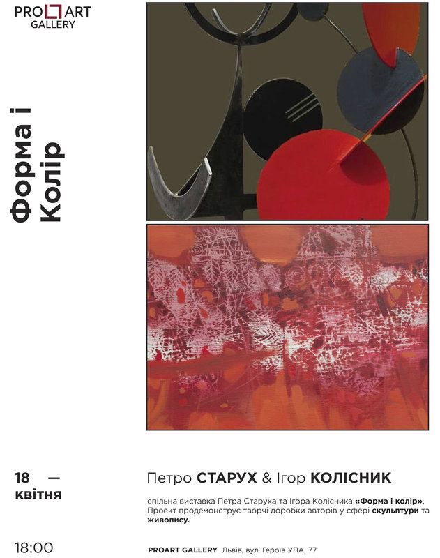 18 квітня (четвер) о 18:00 в Proart Gallery (вул. Героїв УПА, 77) відбудеться відкриття спільної виставки Петра Старуха та Ігора Колісника «Форма і колір». Проект продемонструє творчі доробки авторів у сфері скульптури та живопису.