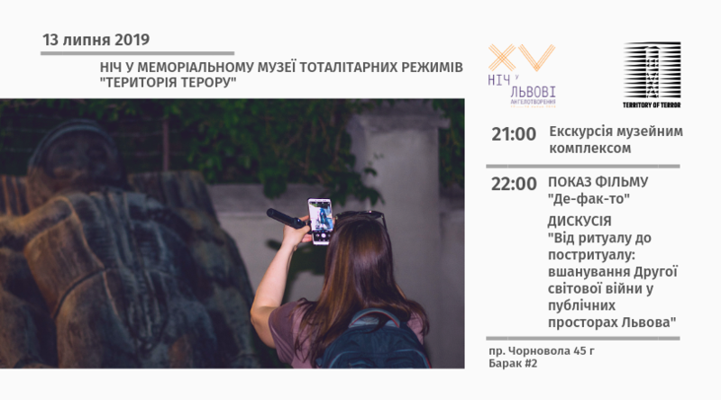 13 липня о 22:00 у Меморіальному музеї тоталітарних режимів "Територія Терору", у межах проведення Фестивалю "Ніч у Львові" відбудуться показ фільму "Де-фак-то" та дискусія "Від ритуалу до постритуалу: вшанування подій Другої світової війни у просторах Львова", а також вечірня екскурсія музейним комплексом. Вхід вільний.