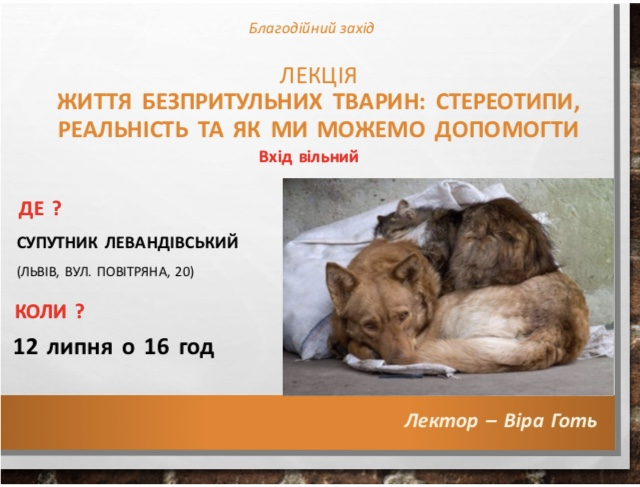 12 липня о 16:00 в Супутнику Левандівському відбудеться благодійний захід + лекція на тему «Життя безпритульних тварин : стереотипи, реальність та як ми можемо допомогти». Метою даного благодійного заходу є збір сухого корму і консервів для котів та собак, повідків та будматеріалів для ГО «Спільна Поміч». На заході буде присутній офіційний представник ГО і в кінці події забере усі принесені небайдужими людьми речі. Лекцію читатиме волонтерка, власниця трьох раніше безпритульних котиків та активна користувачка Фейсбук - Віра Готь. На лекції розглядатимуться такі питання :