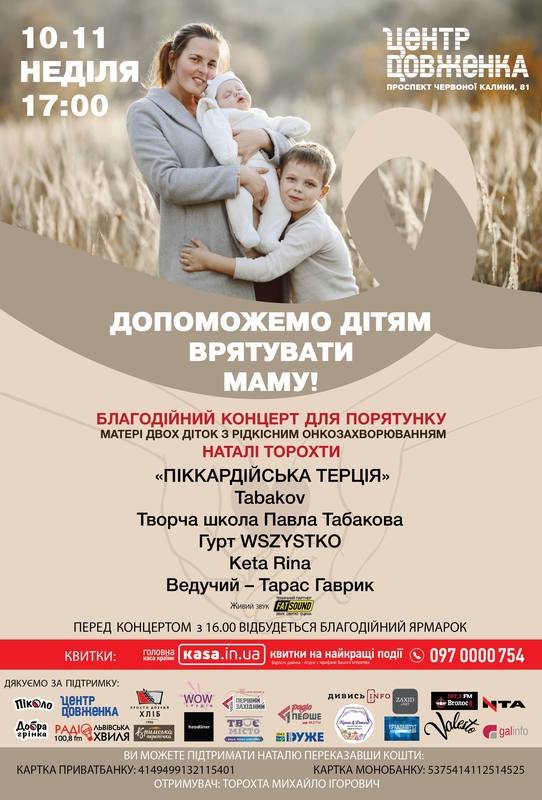Ведучий вечора – Тарас Гаврик. Початок – о 17 год. Квитки можна придбати онлайн kasa.in.ua/ua/lviv/concert/dopomozhemo-ditiam-vriatuvaty-mamu-2019-11-10 та в касах «Центру Довженка». Перед початком концерту з 16 год. в «Центрі Довженка» також відбудеться благодійний ярмарок. Усі виручені кошти будуть спрямовані на дороговартісне лікування Наталі Торохти, яку оперуватимуть у спеціалізованій клініці в Дрездені (Німеччина). Загалом на лікування Наталі потрібно зібрати близько 50 тис. євро.