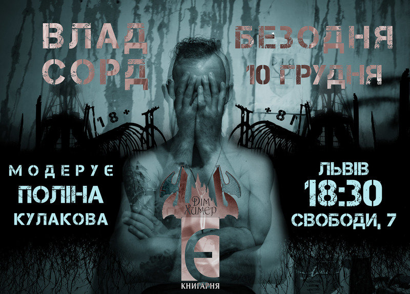 Презентація збірки військових оповідань Влада Сорда «Безодня» у «Книгарні Є». Книгарня «Є» та видавництво «Дім Химер» запрошують на презентацію першої прозової книги відомого поета Влада Сорда під назвою «Безодня», що відбудеться 10 грудня о 18:30 за участі автора. Модерує Поліна Кулакова. «Безодня» — це збірка неймовірних і водночас на диво чесних історій, привезених автором з війни, побаченої на власні очі й прожитої впродовж чотирьох років у польових окопах, на закинутій шахті, у лісах, що повсякчас прострілюються. Тут немає героїзації «своїх» чи демонізації «чужих», це просто війна, котра випала на долю нашому поколінню. А війна не добирає слів та не шкодує куль, війна триває, як і кожна з цих історій, що, проростаючи з реальності, набувають химерних метафізичних сенсів у подобі Чорного Бога й первісного жаху, який завжди чатує на нас поза межами часу й простору. Влад Сорд — поет, прозаїк та ветеран бойових дій, який з перших днів війни чотири роки поспіль захищав Україну на східному кордоні під позивним «Змій». За походженням на чверть норвежець — з дитинства носить довге волосся як данину предкам-вікінгам. Автор поетичних книг «Трансгрес(і)я», «+++» (Три плюси») та збірки військово-містичних оповідань «Безодня», що цьогоріч увійшла до довгого списку Книги року ВВС. Фіналіст Міжнародної літературної премії ім. О. Ульяненка, співзасновник і художній редактор видавництва «Дім Химер». Адреса Книгарні «Є»: м. Львів просп. Свободи, 7 Вхід вільний!