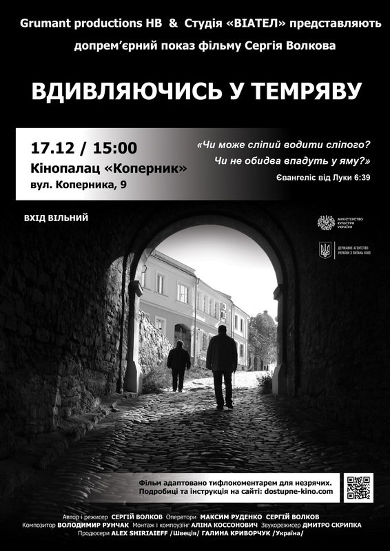 Запрошуємо вас відвідати допрем’єрний показ повнометражного документального фільму режисера Сергія Волкова «Вдивляючись у темряву», а також прохання поширити анонс.