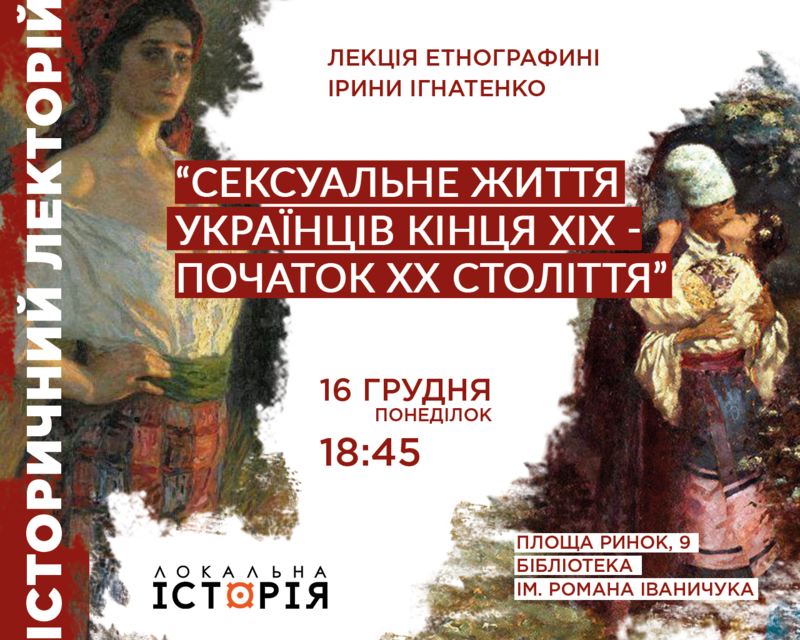 16 грудня о 18.45 в бібліотеці Іваничука (площа Ринок, 9) відбудеться друга лекція циклу - “Сексуальне життя українців кінця ХІХ - початку ХХ століття” Етнографиня Ірина Ігнатенко розкаже про нормування сексуальності молоді, подружній секс та зради,стосунки батьків і дітей у минулому, опираючись на фольклор, етнографічні дослідження кінця ХІХ — початку ХХ століття і сучасні розвідки. ___ Чи були українці XIX століття високоморальними, цнотливими та сором’язливими, чи ці риси їм приписали етнографи й письменники? Яким насправді був секс в українському традиційному суспільстві? Відповідь на ці та інші питання вже цього понеділка!