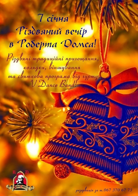 Хмільний дім Роберта Домса вітає Вас з Різдвом Христовим! Нехай свята принесуть радість та затишок Вам і вашим родинам! Ми ж, в свою чергу, будемо раді розділити святкові дні разом з вами. Спеціально до свят ми готуємо традиційні різдвяні частування, веселі колядки та віншування. Ввечері на сцені концертна програма від групи V Dance Band! Чекаємо!