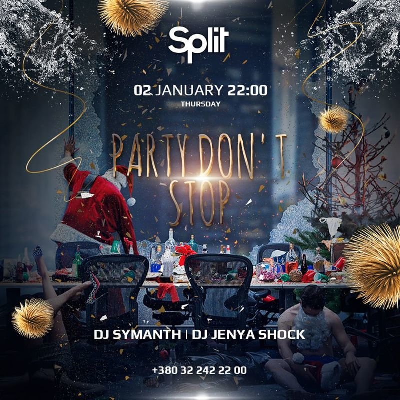 Марафон післяноворічних вечірок у нічному клубі Split тільки починається! Чудова нагода оцінитиусіх наших резидентів-діджеїв, продегустувати усі коктейлі та задати тон своємуновому року.