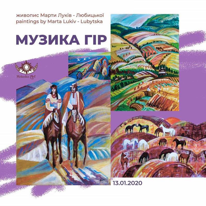 Назва: Музика гір. Персональна виставка живопису Марти Луків-Любицької 13-26 січня 2020 р. Галерея 'Меланка-Арт', вулиця Лесі Українки, 8 Опис: Луків (Любицька) Марта народилася і живе у Львові. У 1985 році закінчила ЛДІПДМ, відділ ПІМ. Працює у галузі декоративного живопису, настінного розпису, графіки і дизайну. Учасниця художніх експедицій “Шевченковими шляхами”, “Місцями Зінаїди Серебрякової” та більш ніж 25 живописних пленерів в Україні та закордоном, зокрема: “Малювати Львів” (Львів, 2018), “Львівські Імпресії” (Львів, 2019); пленерів у Польщі: Юрата (2014), Тшебніца (2015), Слава Сльонська (2016, 2017), Хоцємисль (2018), М’ястко (2019), Баґно (2019), Любачів (2018, 2019). Має 5 персональних виставок, ряд дипломів та нагород, зокрема диплом бієнале живопису в м. Піза, Італія. Бере активну участь у виставках різного рангу. Член НСХУ та ЛТШМ. Творче кредо: живопис = яскравий колір + позитив.