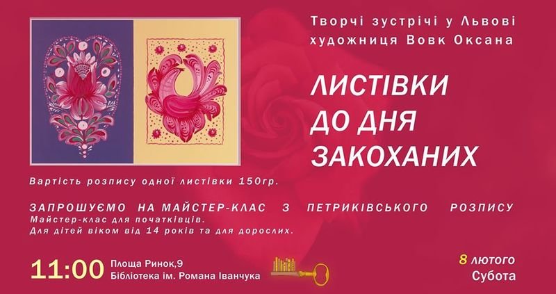 Запрошуємо вас на майстер-клас "ЛИСТІВКИ ДО ДНЯ ЗАКОХАНИХ" периківським розписом. Чекаємо Вас в суботу 8 лютого з 11-00 до 15-00 у місті Львів, Площа Ринок,9 Бібліотека ім. Романа Іванчука Художниця Оксана Вовк проведе два майстер-класи по півтори години. Можна прийти на 11-00 на синю листівку, або на 12-30 на жовту. Кількість місць обмежена, тому просимо вас зареєструватися завчасно. Реєстрація за номером 093 237 35 08 Оксана, або пишить на нашу сторінку "Творчі зустрічі у Львові" Петриківський розпис- це один із приємних і чудових засобів подолати свої страхи, розвинути дрібну моторику, розвинути творче мислення. Малювання петриківським розписом сприяє розслабленню, задоволенню, допомагає знайти свою внутрішню гармонію. Вік учасників від 14 років і до 99, спеціальних навичок не треба. Також на учасників чекає приємний розіграш подарунків. Всі матеріали видаються на майстер-класі. Вартість одного майстер-класу 150 грн, за два разом 280 грн.