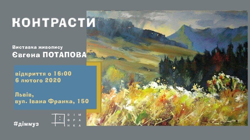 Запрошуємо у #ДімФранка на відкриття виставки живопису Євгена Потапова «Контрасти».Євген Потапов (Евгений Потапов) у своїй творчості сповідує непохитну жанрову любов до краєвиду. Протягом творчого зростання, маючи за плечима базову освіту архітектора, митець із кожним ударом пензля розвинув у собі особливий талант віртуозного живописця, тонкого співця природи. Картинне полотно Євгена Потапова – це неповторний, глибоко переосмислений образ мінливого світу, що характеризується емоційною складовою, базованою на збалансованих спокійних станах природи. Кожен видовий мотив наповнює гармонія колірно-світлового виразу, композиційна врівноваженість, продуманість і майстерна реалізація творчого задуму.