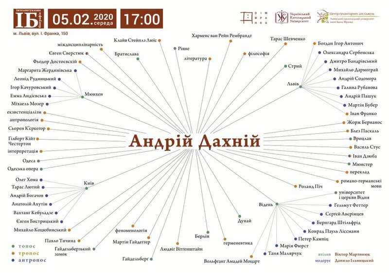 Традиційно зустріч у форматі "Інтелектуальна біографія" передбачає вільну бесіду навколо тріади топос – тропос – антропос, тобто місць, ідей та людей, що впливали на становлення особистості гостя, були визначальними для його особистої інтелектуальної біографії.