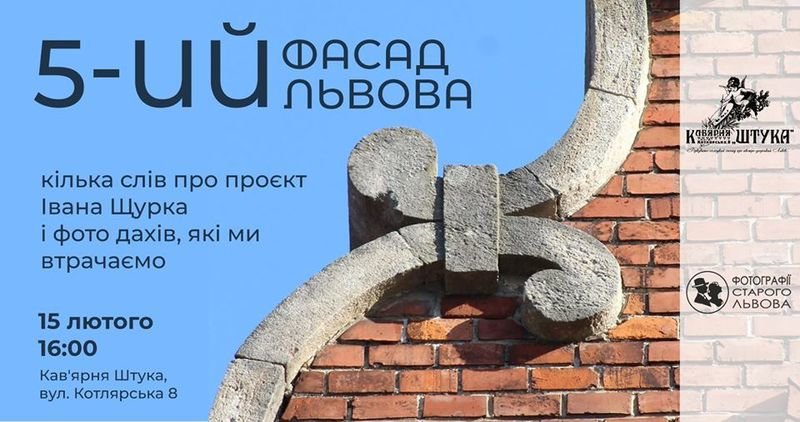 15 лютого, у суботу, о 16:00 кав'ярня-галерея “Штука” запрошує на відкриття виставки Івана Щурка (Ivan Shchurko) 5-ий фасад Львова. Поговоримо з автором про проект та історичні міські дахи, які втрачаємо.