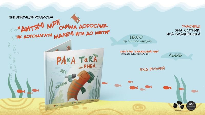 У Львові відбудеться презентація нової книжки письменниці Яни Сотник «Рака така, або Риба, яка співає», що побачила світ у Дитяче арт-видавництво "Чорні вівці". Подія відбудеться у формі бесіди на тему «Дитячі мрії очима дорослих. Як допомагати малечі йти до мети». Присутні подискутують про те, як досягати бажаного, незважаючи на те, що кажуть оточуючі.