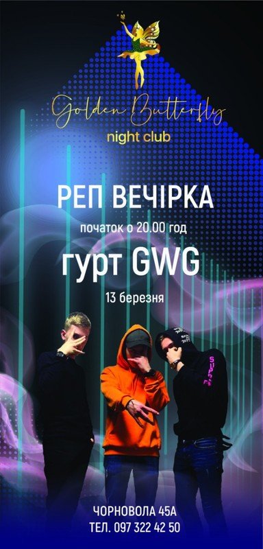 3 друга зі Львову, Їхні пісні набирають сотні тисяч прослуховувань, вони вже 2 роки в індустрії. Вони це "GWG" та 13 березня вони будуть у караоке-клубі "Golden Butterfly"